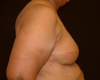 This young woman was diagnosed with right breast cancer at the age of 57. She had a mastectomy at that time, deciding not to have breast reconstruction. One year later she began her delayed breast reconstruction by having a tissue expander placed. The left breast was reduced for symmetry and to relieve her of the significant imbalance in upper body weight distribution. Five months later, the right breast tissue expander was replaced with a 750cc saline implant.