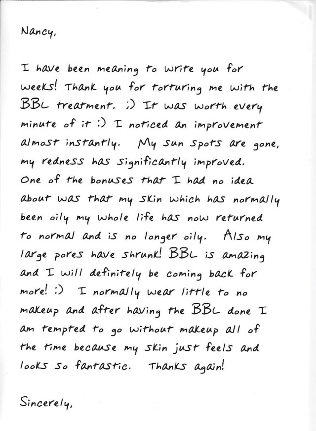 I have been meaning to write you for weeks! Thank you for torturing me with the BBL treatment. :) It was worth every minute of it. :) I noticed an improvement almost instantly. My sun spots are gone, my redness has significantly improved. One of the bonuses that I had no idea about was that my skin which has normally been oily my whole life has now returned to normal and is no longer oily. Also my large pores have shrunk! BBL is amazing and I will definitely be coming back for more! J I normally wear little to no makeup and after having the BBL done I am tempted to go without makeup all of the time because my skin just feels and looks so fantastic. Thanks again! Sincerely,